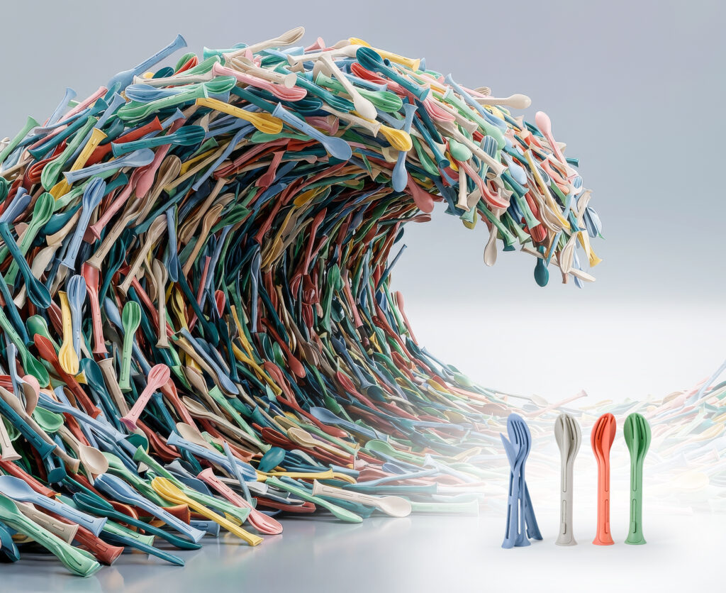 Sonderpreis „Plagiats-Tsunami“ – Besteck-Sets „KLIKK“ und „KLIKK POCKET“. Quelle: Aktion Plagiarius e. V. – Vorne das Original, darüber als Tsunami die Fälschungen.